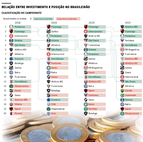 * O jornal O Globo fez uma comparação entre os times que mais e menos investiram nos últimos quatro anos, comparando-os nas tabelas de classificação. No geral, quem mais investiu ficou na parte de cima da tabela, salvo algumas exceções, como o Grêmio em 2021.